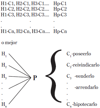 (Léase: El hecho condicionante H1 está conectado con la consecuencia jurídica C1,etc.),lo que significa que cada hecho de una cierta totalidad de hechos condicionantes (H1 - Hp) está conectado con cada una de las consecuencias de cierto grupo de consecuencias jurídicas (C1- Cn); o que cada hecho H está conectado con el mismo grupo de consecuencias jurídicas (C1 + C2. . . + Cn), O que una pluralidad acumulativa de consecuencias jurídicas está conectada con una pluralidad disyuntiva de hechos condicionantes.3