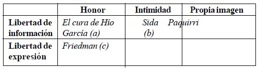 El primero se traduce en la construcción de una taxonomía que permita ubicar cada caso dentro de una determinada categoría, lo que constituye el primer esfuerzo argumentativo del tribunal. A partir de los supuestos que hemos examinado (y que, naturalmente, constituyen sólo una pequeñísima porción de los resueltos por el tribunal en esta materia), es fácil concluir que existen, básicamente, tres tipos de conflicto, según que la contraposición tenga lugar: a) entre la libertad de información y el derecho al honor: b) entre la libertad de información y el derecho a la intimidad, y c) entre la libertad de expresión y el derecho al honor. El siguiente cuadro permitirá verlo de manera gráfica: