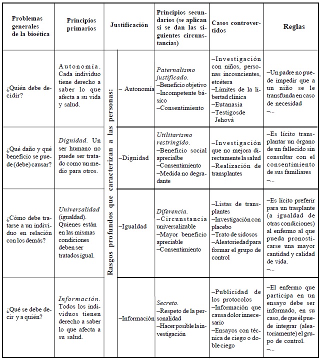 Ahora bien, esta serie de principios (y suponiendo que se aceptaran las formulaciones que acabo de proponer) no permiten, naturalmente, resolver, sin más ayuda, la diversidad de casos difíciles que pueden surgir en la bioética. Por un lado, porque es razonable pensar que existen (o que pueden llegar a existir) otros conjuntos de circunstancias que lleven a la formulación de nuevos principios. Por otro lado, porque, aun cuando nos circunscribamos a los anteriores, ellos necesitan ser precisados –concretados– en forma de reglas. Por ejemplo, de acuerdo con lo anterior, cabría concluir que no se puede rechazar ab initio la posibilidad de un ensayo que no suponga un beneficio (o incluso que pueda suponer un daño) para los enfermos que participan en el mismo, pero eso no es todavía suficiente para autorizar, o no autorizar, un determinado ensayo clínico de esas características; en este sentido, puede decirse que los principios son inconcluyentes: por sí mismos no permiten resolver definitivamente un caso. Además de principios, necesitamos reglas que precisen, por ejemplo, hasta dónde ha de llegar el riesgo para una persona y el beneficio para otra, qué cabe entender por medidas no degradantes, etcétera. Pero eso nos lleva a la conclusión (véase, en el cuadro que sigue, una presentación conjunta de todo lo anterior) de que el problema fundamental de la bioética es el de pasar del nivel de los principios al de las reglas; o, dicho de otra manera, construir, a partir de los anteriores principios (que, con alguna que otra variación, gozan de un amplio consenso) un conjunto de pautas específicas que resulten coherentes con ellos y que permitan resolver los problemas prácticos que se plantean y para los que no existe, en principio, consenso.