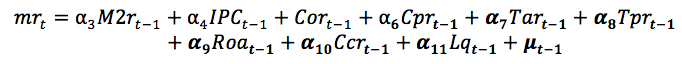 Donde mrt es la variable dependiente (índice de morosidad) del sistema bancario venezolano en el período t, mientras que del lado derecho de la ecuación se ubican las variables explicativas (macroeconómicas y microeconómicas) con el signo esperado para cada una ellas, α representa la heterogeneidad no observable, es μt el término de perturbación y t-1 representa los rezagos de cada una de las variables.
