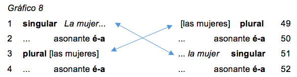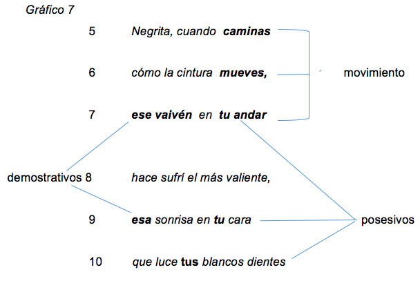 Esto es, cuando parece alcanzarse una linde estrófica (versos 5-8), esta se difumina en virtud de una recomposición que echa pie dos versos atrás y progresa dos más adelante (versos 7-10). El sentido se forja en virtud de ese movimiento de avance, retroceso y avance que instituye entre los constituyentes versales vínculos que se resisten a la disolución que supondría su adaptación al moldeado estrófico. Los medios sintácticos y semánticos contribuyen al reforzamiento de esta urdimbre a través de reiteraciones parasinonímicas y con el empleo de posesivos y demostrativos, en combinación con medios métrico-formales como la disposición paralelística, etc.: