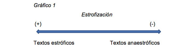 Imaginemos un eje doblemente orientado que representara el fenómeno general de la organización estrófica (es decir, la combinatoria versal para la configuración del texto) y en cuyos polos se situaran los valores extremos, es decir, las tendencias a la máxima y a la mínima estrofización:
