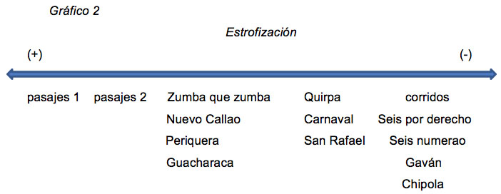 Volvamos a nuestro eje de la estrofización. Si ahora le remitiéramos algunas de las piezas más características del repertorio tradicional llanero (en la mayor proporción joropos cuyo soporte musical es casi siempre anónimo), al igual que la categoría general de pasajes, apreciaremos que a partir de sus extremos los espacios intermedios acogen especímenes los que las tendencias opuestas se combinan en diferente medida: