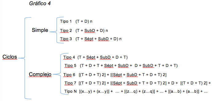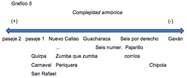 Por otra parte, los ciclos mismos admiten ser clasificados a partir de su grado de complejidad interna, según el número de grados o funciones armónicas que los constituyan. Así, el ciclo armónico más simple es el que consta de solo dos funciones (tónica + dominante). Consideraremos simples también los ciclos de tres funciones (tónica + subdominante + dominante) y de cuatro (tónica + séptima + subdominante + dominante). Cada una de estas variantes constituye un tipo específico. Por otra parte, los ciclos armónicos complejos constituyen una gama relativamente amplia de posibilidades, ya sea porque la secuencia de grados básicos o funciones sigue un itinerario de mayor longitud (por ejemplo: tónica + dominante + tónica + séptima + subdominante + tónica + dominante + tónica), ya sea porque presenten desvíos modulativos que enriquecen el repertorio de grados básicos, ya sea porque se produzcan repeticiones de temas melódicos (en los casos en que haya más de uno). Puesto que la categoría que hemos denominado ciclo armónico complejo es potencialmente no finita en lo que respecta a sus propios tipos (la tradición ha impuesto algunos dominantes o canónicos pero la creatividad de los poetas populares los multiplica en variantes sin cesar), y no siendo nuestra aspiración en este estudio aproximativo llevar a cabo un inventario exhaustivo de aquellos (tarea que resultaría siempre provisional e inconclusa), nos limitaremos a ofrecer unos pocos ejemplos. El esquema que sigue resume lo expuesto:
