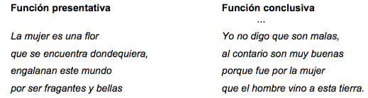 En este caso, las dos partes (que hemos transcrito parcialmente) se diferencian porque en la primera la tendencia a la estrofización está ausente: la pareja inicial de versos cumple la función de introducir el asunto mientras que en el resto del texto se emplean conectores y fórmulas de enlace para asegurar la concatenación lógico-semántica de las diversas secciones. La segunda parte muestra patentemente la pauta estrófica y las cinco cuartetas que la componen (de las que adujimos solo dos) gozan de autonomía relativa formal y temática (cada una describe a un tipo de mujer según el color de la piel) dentro la coherencia global o isotopía propia del poema.