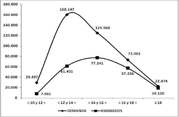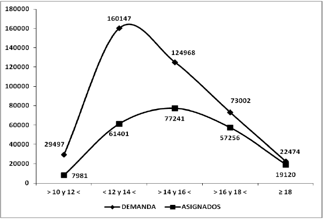 Sin embargo, al analizar el nivel académico de los asignados, el comportamiento fue totalmente diferente. Por una parte, el mayor grupo asignado presentó un mayor promedio de notas (77. 241): de ≥14 a >16 en relación a los aspirantes; y por otra parte, los grupos de mayor nota promedio que aspiraron al cupo, fueron asignados en un gran porcentaje. Por ejemplo: en el grupo de nota promedio de ≥16 a > 18 puntos fue asignado el 78% (57.256) de los aspirantes, mientras que el grupo con nota promedio ≥18 fue asignado en el 85,1% (19.120). Estos resultados demuestran que es falsa la matriz de opinión que han dado algunas autoridades rectorales de universidades de la AVERU después de haberse realizado la asignación de cupos en el 2015, cuando expresaron que el “Método de asignación de la OPSU desmerita el rendimiento académico” (Jorge, 2015). Además, es importante hacer notar que el cálculo de la nota es similar al que se venía realizando para la asignación desde el año 2008 que corresponde al Modelo Multivariable basado en lógica difusa para la asignación, la cual presenta un alto grado de confiabilidad en términos de su procesamiento.