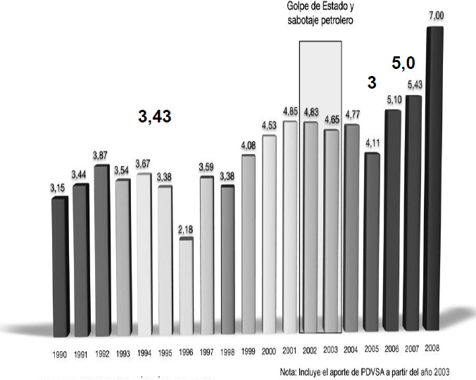 Estas políticas implicaban una gran inversión por parte del Estado para garantizar la inclusión mediante un mayor número de plazas, contratación de cargos de trabajadores universitarios –obreros, empleados y profesores–, nuevas instituciones y/o sedes con infraestructuras remodeladas o nuevas, entre otras. Al comparar tal inversión entre la IV y V república se podrá visualizar la dimensión real de tales aportes, tal como se observa en la Figura 1. En ella, podemos ver que en la IV República, específicamente en la década de los 90 del siglo anterior (1990-1998), los gobiernos neoliberales invirtieron en educación el 3,43% promedio del PIB, destacándose el menor valor de 2,18% en 1996, como consecuencia de la crisis bancaria ocurrida en el segundo gobierno de Rafael Caldera; mientras que los primeros 10 años del gobierno revolucionario de Hugo Chávez (1999-2008), la inversión social en educación se incrementó continuamente, promediando un valor correspondiente al 5,03% PIB, alcanzando el mayor valor en el 2008 con un 7%, es decir, un incremento del 104% con respeto al valor promedio en la década anterior.