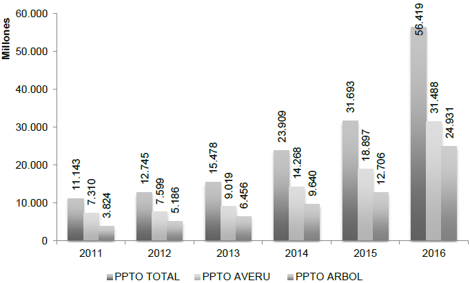 En la Figura 3 se muestra el Presupuesto Ley desde el año fiscal 2011 hasta el mes de junio de 2016 que han tenido las instituciones educativas universitarias (IEU): Bs 11.142.811.856 en 2011 a la cantidad de Bs 56.419.147.023 (406% de incremento) en el 2016. Además, se puede observar en el gráfico que el grupo de universidades, cuyas autoridades conforman la Asociación Venezolanas de Rectores universitarios (AVERU) recibieron la mayor parte de tales presupuestos en relación a las universidades, cuyas autoridades constituyen la Asociación de Rectores Bolivarianos (ARBOL). Es importante indicar que ambos grupos de instituciones, son universidades nacionales autónomas, tal como lo definen los Artículos 108 y 109 de la Ley Orgánica de Universidades (1970) vigente.