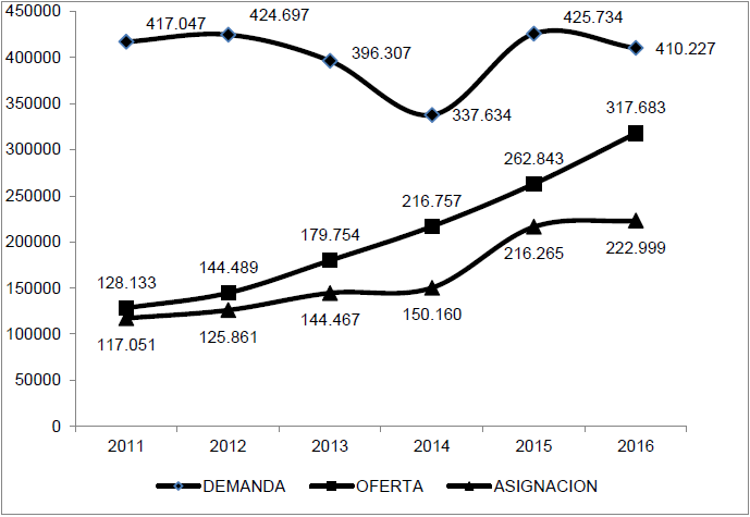 Ese año quedaron no asignados 2.705 bachilleres y para el año 2016, la cantidad de no asignados ascendió a 3.525 aspirantes.
