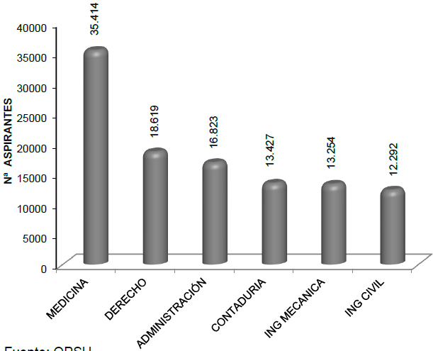 En la Figura 6 se grafican las 6 carreras más demandadas por los aspirantes a nivel nacional, destacando que Medicina ocupa el primer lugar con 35.414 aspirantes en el registro 2016, mientras que el año 2015 la demanda fue superior a 31.000 personas (Alfonzo y col., 2016). Esta es una de las causas de la cantidad de aspirantes que no son asignados al final del proceso, es decir, el cupo limitado (2.282) que ofrecen las IEU (excepto por Medicina Integral comunitaria, quien ofrece muchos más plazas) para esta carrera de Medicina no es suficiente (datos no mostrados). Esta es la razón de que existen aspirantes con altos promedios en sus trayectorias académicas en la educación media pero no quedan asignados en Medicina, dado el bajo número de plazas ofertadas.