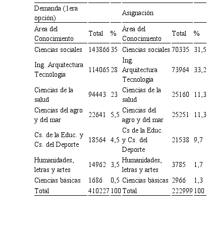 El proceso de asignación para el año 2016, cuyos resultados obtenidos el 04 de julio fueron los siguientes: 410.227 personas aspiraron al ingreso, quedando asignados 222.999 estudiantes, es decir, el 54 % de los aspirantes. En la tabla 2, se muestran los valores absolutos y en porcentaje del número de aspirantes y asignados por área de conocimiento, destacando que el área más asignada es la de Ingeniería, Arquitectura y Tecnología (33,2%). Mientras que el área que presentó la menor demanda (0,5%) y con menor asignación (1,5%) fue el área de las Ciencias Básicas, aunque el gobierno nacional ofreció becas (Fundayacucho) para aquellos que optaran y quedaran asignados en esta área, la cual es considerada de alta prioridad para las políticas de desarrollo del alto gobierno.