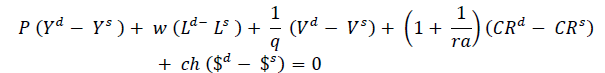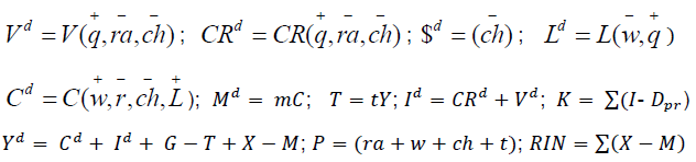 A partir del cese de los acuerdos monetarios de Bretton Woods ocurrido en el lapso 1971-1973, el riesgo cambiario, el incremento del uso de los medios de pagos privados, la titularización20, la incertidumbre y la exacerbación especulativa (Big Bang Financiero-petrolero)21, toman el centro del escenario económico. Así el ajuste de los mercados de crédito (𝐶𝑅𝑑 − 𝐶𝑅𝑠) de títulos (𝑉𝑑 − 𝑉𝑠) y de divisas ($𝑑 − $𝑠) determina la inversión reproductiva (𝐼𝑑 = 𝐶𝑅𝑑 + 𝑉𝑑) y condiciona el de los restantes mercados [bienes de consumo (𝑌𝑑 − 𝑌𝑠) y requerimientos laborales (𝐿𝑑 − 𝐿𝑠) ] enfatiza los roles de las tasas de interés (ra, rd, rf) de rendimiento del capital (q), del tipo de cambio (ch) y (t) la tasa impositiva promedio; correspondiendo los supra índices (d) y (s) a los conceptos demanda y oferta.