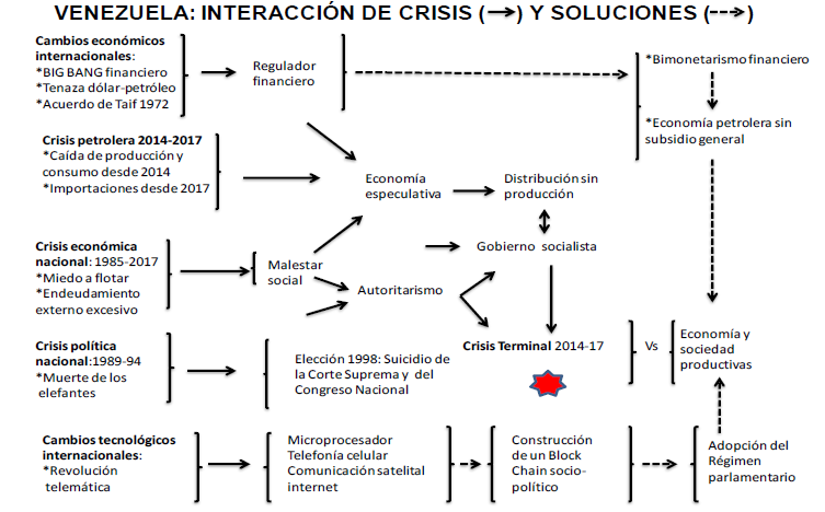 Circunstancia que la élite política venezolana, incluida la fragmentada oposición, no ha comprendido, embozalada por la imagen del Petro Estado; persistiendo el gobierno inaugurado en 1999, en políticas esquizofrénicas (endeudamiento externo y devaluación) agravado ello por la inclusión de gastos dedicados a subsidios generalizados (proclives a la corrupción generalizada); sin que la oposición, con menguado arrastre popular (crisis política), al no presentar alternativas factibles y creíbles, promueve, con su ingenuidad, el desencuentro entre sus objetivos políticos (acceder al poder) y las exigencias económicas de la población.