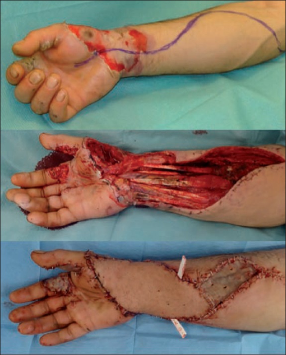 Results: Eight flaps to reconstruct the 6 upper limbs and 2 amputations in the middle of forearm were needed. We used 6 free flaps, 1 local flap and 1 distant flap. Cutaneous/fasciocutaneous flaps and muscular flaps were used 6 and 2 times respectively and 100% of the patients presented high levels of creatine phosphokinase (CPK) because of muscular damage, 2 of them needed renal replacement therapy.