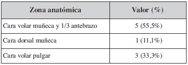 El daño generado por la corriente eléctrica puede dividirse en térmico, por la reacción exotérmica que sucede al paso de la corriente por tejidos que ofrecen una resistencia eléctrica; y por electroporación.(3) En esta última forma se verán afectadas las células con una mayor superficie, es decir, las neuronas y las células musculares.(4) Aunque se conoce que la liberación de energía es mayor en aquellos tejidos que presentan una mayor resistencia al paso de la corriente eléctrica, Hunt y col. señalaron que las propiedades conductoras de cada tejido resultan menos importantes que la resistencia relacionada con la superficie transversal. De esta manera, Zelt y col.(5) reconocieron como zonas de choque (choke points) aquellas regiones anatómicas que resultaban más dañadas por el paso de la corriente eléctrica debido a su menor diámetro transversal. Estas zonas de choque se corresponden con regiones articulares, como la muñeca o el codo, donde se concentran estructuras vásculo-nerviosas y tendinosas de gran importancia que se verán seriamente afectadas (Fig. 2). En nuestra serie de casos puede verse como los mayores problemas de cobertura aparecieron en la muñeca, donde fue necesario el empleo de colgajos (Tabla III).