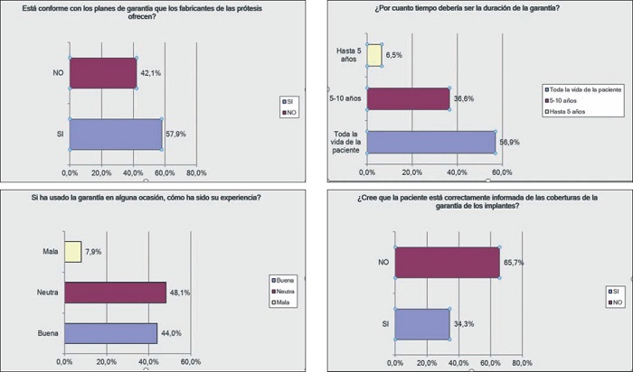 Entre los que creen que la garantía da problemas (n=45, 20.8%) la razón es la falta de claridad de lo que dicha garantía ofrece, la falta de confianza en su aplicación por parte del fabricante, las dudas sobre su ejecución o validez a largo plazo, y los informes de las empresas fabricantes respecto a las causas de las roturas de los implantes retirados de las pacientes (roturas iatrogénicas). Un 11.2% (n=24) de los encuestados no dieron su opinión respecto a este punto, en su mayor parte por no haber tenido que usar nunca la garantía.