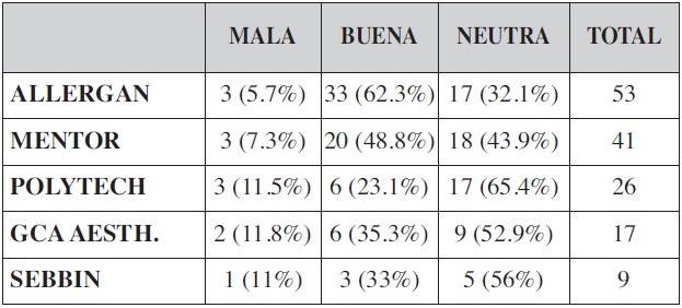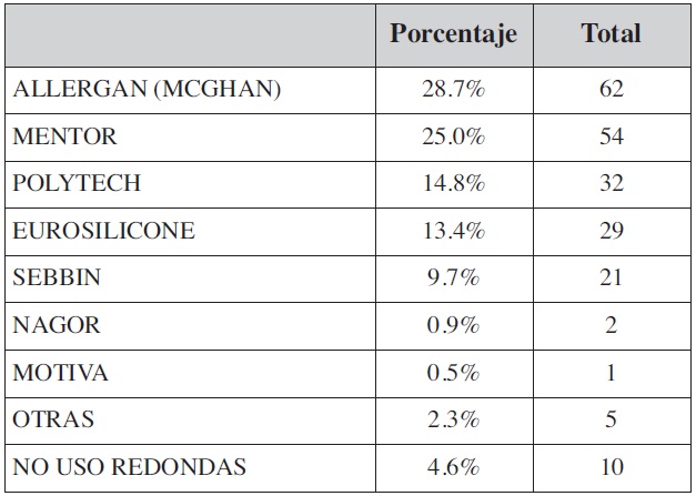 Los fabricantes norteamericanos Allergan® (Allergan, Inc., Irvine, California, EE.UU.) y Mentor® (Mentor Worlwide LLC, Santa Bárbara, California, EE.UU.) acaparan las preferencias de los encuestados con un 60.2% frente a un 32.4% que prefieren marcas europeas. Un 7% de los encuestados nunca usan prótesis anatómicas (Tabla V).