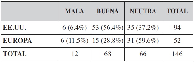 No encontramos diferencia significativa entre las 2 principales marcas de implantes, Allergan® y Mentor® en cuanto a los distintos niveles de satisfacción con la garantía. Si comparamos entre fabricantes de EE.UU. y de Europa, encontramos que entre los que han tenido una buena experiencia con la garantía, un 56.4% (n=53) ha sido con las prótesis de EE.UU. y un 28.8% (n=15) con las europeas (p <0.05). Para el nivel de satisfacción neutro, un 37.2% (n=35) usaban prótesis norteamericanas y un 59.6% (n=31) europeas (p <0.05); y entre los usuarios con mala experiencia con las garantías, un 6.4% (n=6) usaban prótesis de fabricación norteamericana y un 11.5% (n=6) europeas (p =0.1) (Tabla XIV).