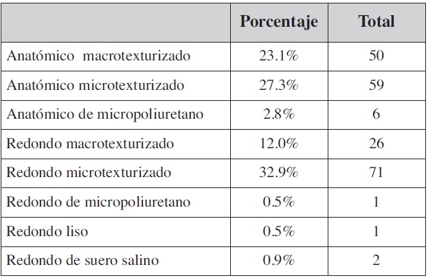 No encontramos diferencia significativa entre los cirujanos que prefieren usar prótesis anatómicas y los que optan por las prótesis redondas como primera elección. En ambos tipos, las marcas más usadas son las norteamericanas.