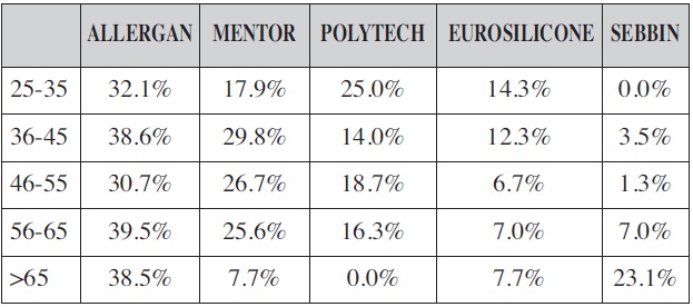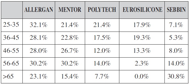 En cuanto a la edad del cirujano, detectamos cierta preferencia por la marca Allergan® para los implantes redondos, excepto en cirujanos mayores de 65 años entre los que la marca Sebbin® (Group Sebbin SAS, Francia) fue la preferida (Tabla VIII).