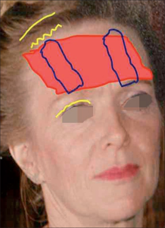Existen diversos procedimientos para tratar estas arrugas frontales; muchos son rápidos y mínimamente invasivos, como la toxina botulínica y la inyección de productos de relleno dérmico. Sin embargo, estos métodos son caros a largo plazo y tienen una duración corta en el tiempo de sus resultados, teniendo que ser repetidos cada 3-6 meses.(15) Por lo que se refiere a los procedimientos quirúrgicos, fueron descritos para mejorar el aspecto de la frente eliminando arrugas y otros signos de envejecimiento. Tras las primeras descripciones de Marino con su incisión sobre el músculo frontal, autores como Uchida, en 1965, propusieron técnicas quirúrgicas para corregir la hipermotilidad de los músculos frontales.(1,16) Después de esto, muchos otros cirujanos propusieron técnicas para lograr mejoría y resultados más duraderos, con múltiples procedimientos quirúrgicos que pueden ser hechos a través de incisiones coronal, temporal, transcapilar o endoscópica.