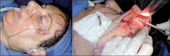 La técnica quirúrgica que describimos en este estudio puede ser realizada a través de incisiones transcapilar, precapilar o transpalpebral, la última por lo general en asociación con blefaroplastia superior (Fig. 1 y 2). Para evitar la ptosis de la parte central del frontal recomendamos los métodos de suspensión, como el propuesto por Graziosi.(6,7)