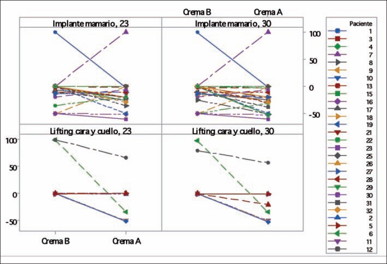 En el Gráfico 2 representamos los cambios de los puntajes de la escala VSS para cada paciente con implantes mamarios los días 23 y 30 en comparación con el control inicial y según el tratamiento. En la mayoría de los pacientes constatamos un efecto favorable con el tratamiento mediante la crema A frente a la B, a excepción de 3 casos (pacientes n° 16, 28 y 30).