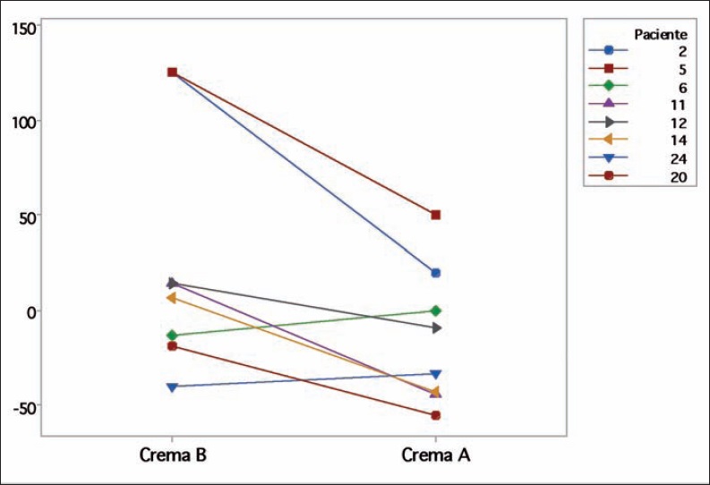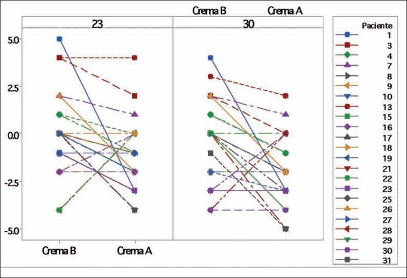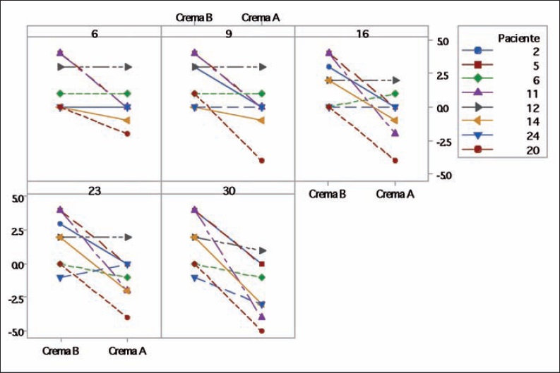 En el Gráfico 3 representamos los cambios en los puntajes de la escala VSS para cada paciente con estiramiento cérvico-facial los días 6, 9, 16, 23 y 30 respecto del control inicial y según el tratamiento. En la mayoría de los casos observamos un efecto favorable con la crema A frente a la B.