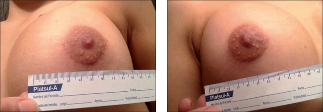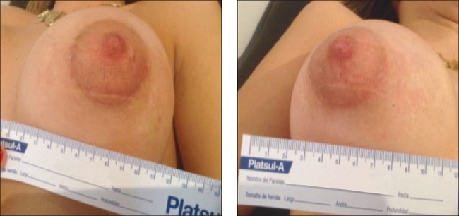 En el grupo de pacientes con implantes mamarios, el porcentaje de cambio no dinrió significativamente entre los 2 tratamientos estudiados en los controles de los días 3, 6, 9, 16 y 23. A los 30 días detectamos una diferencia estadísticamente significativa (p=0.017). El porcentaje de disminución fue significativamente mayor en las cicatrices tratadas mediante la crema con sulfadiazina de plata, vitamina A y lidocaína (crema A) en comparación con la crema sin principios activos (crema B) (18.6 y 9.5%, respectivamente) (Tabla III).