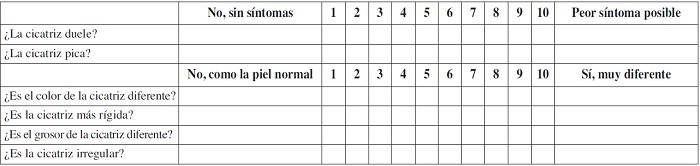 En todas las consultas evaluamos: 1) La superficie de cada cicatriz multiplicando longitud por anchura medidas con una regla con graduación milimétrica. 2) La calidad de cada cicatriz cuantificada mediante la escala VSS,(6) que evalúa los parámetros de pigmentación, vascularización y altura (Tabla I). 3) La percepción del paciente de cada cicatriz cuantificada mediante la escala POSAS,(7) que evalúa los parámetros de síntomas y aspecto por parte del paciente (Tabla II).