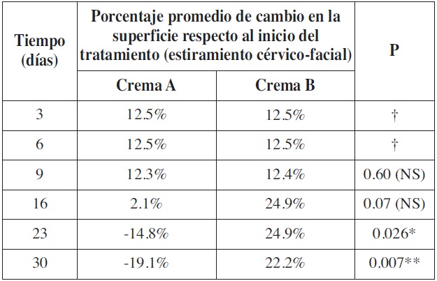 En el grupo de pacientes con estiramiento cérvico-facial, el porcentaje de cambio no difirió significativamente entre los tratamientos los días 3, 6, 9 y 16. Sin embargo, a los 23 y 30 días detectamos una diferencia estadísticamente significativa (p=0.026 y p=0.007, respectivamente). El porcentaje de disminución fue significativamente mayor en las cicatrices tratadas con la crema A frente a las que se trataron con la crema B. El día 23, las cicatrices tratadas con la crema A disminuyeron su superficie en un 14.8% de promedio, mientras que las tratadas con la crema B aumentaron en un 24.9% de promedio. El día 30, la superficie de la cicatriz disminuyó un 19.1% de promedio en las tratadas con la crema A, y aumentó en un 22.2% de promedio en las tratadas con la crema B (Tabla IV).
