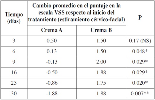 En el grupo de pacientes con estiramiento cérvico-facial, el cambio del puntaje de la escala VSS no difirió significativamente entre los tratamientos a los 3 días. En cambio, en todos los controles siguientes observamos una diferencia estadísticamente significativa (p <0.05). La disminución del puntaje fue significativamente mayor en aquellas cicatrices tratadas con la crema A frente a las tratadas con la crema B. El día 23, las cicatrices tratadas con la crema A disminuyeron 0.86 puntos de promedio, mientras que las tratadas con la crema B aumentaron 1.75 puntos de promedio. El día 30, la disminución promedio fue de 1.88 puntos en las tratadas con la crema A mientras que las tratadas con la crema B aumentaron 1.88 puntos de promedio. (Tabla VI).