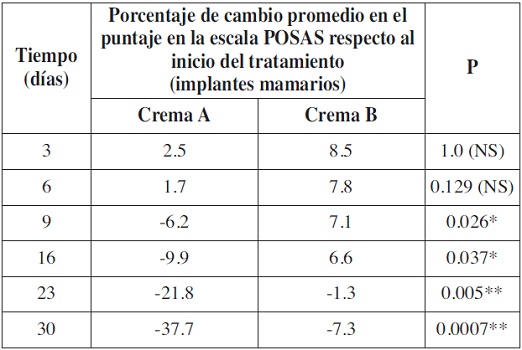 En el grupo de pacientes con implantes mamarios, el cambio porcentual del puntaje de la escala POSAS no difirió significativamente entre los tratamientos los días 3 y 6, pero en los controles restantes constatamos una diferencia estadísticamente significativa (p <0.05). La disminución porcentual del puntaje fue significativamente mayor en aquellas cicatrices tratadas con la crema A frente a las tratadas con la crema B. El día 23, las cicatrices tratadas con la crema A disminuyeron 21.8 puntos de promedio, mientras que las tratadas con la crema B lo hicieron 1.3 puntos de promedio. El día 30, la disminución promedio fue de 37.7 puntos en las tratadas con la crema A mientras que en las tratadas con la crema B la disminución fue 7.3 puntos de promedio. (Tabla VII).