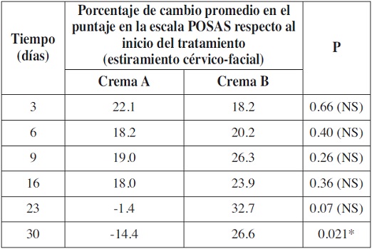 En el grupo de pacientes con estiramiento cérvico-facial, el cambio porcentual del puntaje de la escala POSAS no difirió significativamente entre los tratamientos los días 3, 6, 9, 16 y 23. A los 30 días, detectamos una diferencia estadísticamente significativa (p=0.021). El porcentaje de disminución fue significativamente mayor en los casos tratados con la crema A frente a la B. El día 30, las cicatrices tratadas con la crema A disminuyeron un 14.4% de promedio, mientras que las tratadas con la crema B aumentaron un 26.6% de promedio (Tabla VIII).