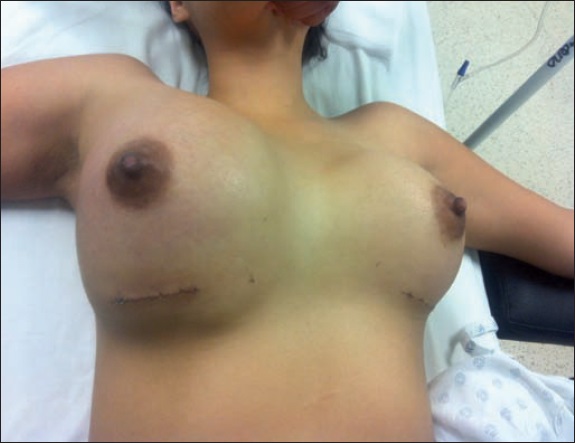 Mujer de 22 años de edad, sin antecedentes médicos de importancia conocidos, intervenida quirúrgicamente para realizarle mamoplastia de aumento en otro centro médico a 250 km de nuestra ciudad. Según informe clínico se le había realizado, bajo anestesia general y con abordaje submamario, colocación de implantes mamarios en plano retromuscular, marca Silimed® (Silimed, Brasil), redondos, con cubierta de poliuretano, de 330cc de volumen y perfil alto, modelo: 30622-330; La operación fue realizada en régimen ambulatorio y el postoperatorio cursó con evolución inicial adecuada, sin complicaciones aparentes.