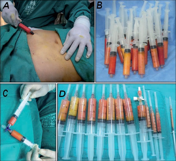 Obtenemos tejido graso mediante lipoaspiración manual utilizando jeringas de 20 cc y cánula roma de 2mm, previa infiltración húmeda del área dadora con una solución compuesta por 500 cc de solución salina y 1 cc de epinefrina (Fig. 2A). El tejido liposuccionado se deja decantar durante15 minutos (Fig. 2B), y se eliminan las capas de líquido para obtener una jeringa con tejido graso puro que se trasvasa entre sí (Fig. 2C), luego a jeringas de 3 cc y de 1 cc listas para ser utilizadas (Fig. 2D), sin centrifugación.