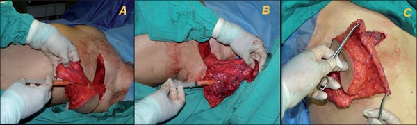 Con el colgajo de latissimus dorsi expuesto en el tórax anterior, y bajo visión directa, se realiza la lipoinyección intramuscular en sentido retrógrado formando minibolos laminados en todos los planos, utilizando jeringas de 3 cc, 1cc y ocasionalmente de 5 cc, con aguja hipodérmica de 18G y 21G (Fig. 3 A y B). Como resultado, el músculo flácido adquiere volumen y se torna semirrígido (Fig. 3C); a su vez se inyecta en el plano muscular del pectoral, en el tejido celular subcutáneo de la isla cutánea y del tórax.