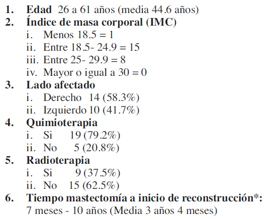 Realizamos y analizamos 24 reconstrucciones mamarias diferidas y unilaterales realizadas entre enero de 2011 y junio de 2015 en igual número de pacientes, todas ellas con mastectomía radical modificada, en el Servicio de Cirugía Plástica y Quemados del Hospital Nacional Guillermo Almenara Irigoyen (Lima, Perú). Las edades de las pacientes fluctuaron entre los 26 y los 61 años (media de 44.6 años); el 79.2 % (n=19 casos) recibió quimioterapia y el 37.5% (n=9) radioterapia postmastectomía. Cabe resaltar que las mastectomías fueron realizadas entre los 7 meses y los 10 años (media 3 años y 4 meses) antes del inicio de la reconstrucción (Tabla I).