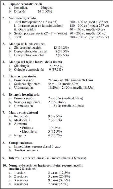 Resultados: Se realizó este tipo de reconstrucción en 24 pacientes; el volumen total lipoinjertado fue de 380 a 780 cc (media de 525 cc) en 1 a 4 sesiones quirúrgicas. Se inició con el colgajo y la primera sesión de microinjerto graso intraoperatorio, aplicando entre 260 a 400 cc (media de 332 cc) en todos los tejidos expuestos. El 80% de este volumen inicial se inyectó en el colgajo miocutáneo, evidenciándose clínicamente un alto grado de prendimiento.En el 45.8%de los casos fue necesaria la desepitelización de la isla cutánea y en el 37.5% se realizaron colgajos de transposición en la zona lateral de la mama. Todos los resultados fueron satisfactorios y las complicaciones fueron menores.