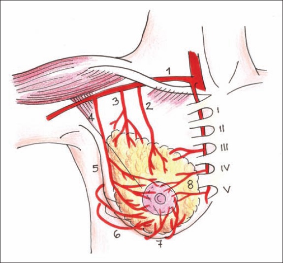 En nuestro estudio, la irrigación del CAP en las pacientes con cirugía mamaria previa estudiada mediante tomosíntesis presentó un predominio de arterias provenientes de los cuadrantes superiores, tanto de la arteria mamaria interna como de la externa, siendo más dominante la irrigación de la primera, lo cual concuerda con lo encontrado en la literatura por Van Deventer y col.(7) en sus estudios de 2004 en cadáveres y por Nakajima y col.(8) en su estudio de 1994 en cadáveres frescos.