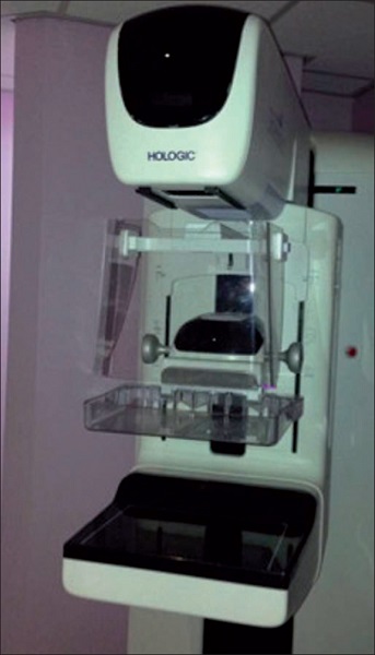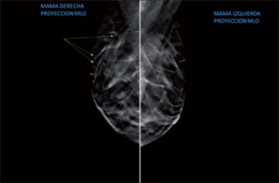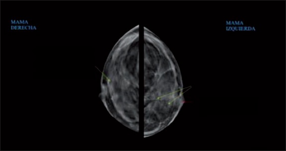 El examen preoperatorio incluyó tomosíntesis (mamógrafo Selenia 3D dimensions, Hologic®, Boston, EE.UU.) (Fig. 3) en el Centro Médico Docente la Trinidad (Caracas, Venezuela) para determinar la distribución de los vasos sanguíneos perforantes en ambas mamas. Las imágenes fueron evaluadas por los médicos radiólogos de dicho centro con monitores de alta resolución de 5 megapixeles, quienes emitieron informes con los resultados a nuestra unidad. Anotamos las variables de las pacientes y los datos obtenidos en la investigación y los registramos en un instrumento de recolección de datos que incluyó: nombre y edad de la paciente, tipo de cirugía estética previa en mamas, número de cirugías previas y mapeo de distribución de vasos perforantes vistos por mamografía 3D. Analizamos los resultados determinando así la técnica quirúrgica o pedículo idóneo para elegir la técnica de cirugía mamaria secundaria y predecir su resultado final evaluando la presencia o no de complicaciones, entre ellas la necrosis del CAP.