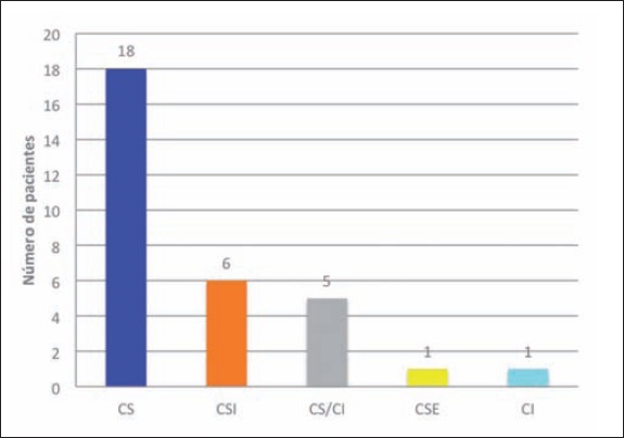 El mayor porcentaje de pacientes de nuestro grupo de estudio se encontraba entre los 41 y los 46 años de edad (media de 42 años); la paciente más joven tenía 25 años y la de más edad 63 años.
