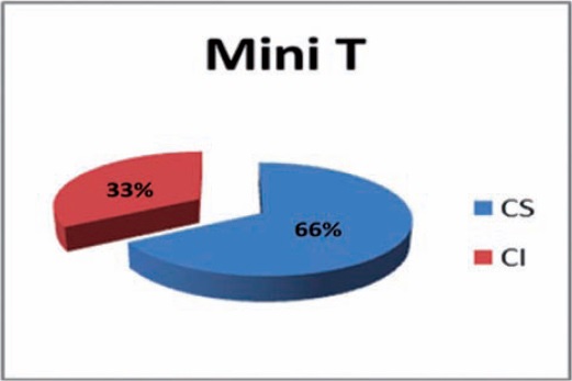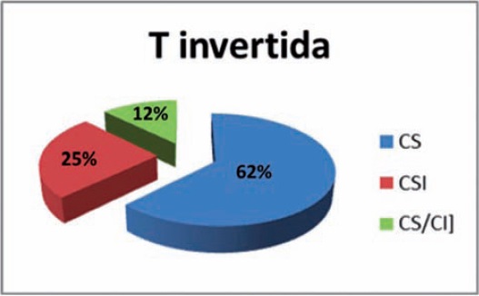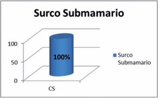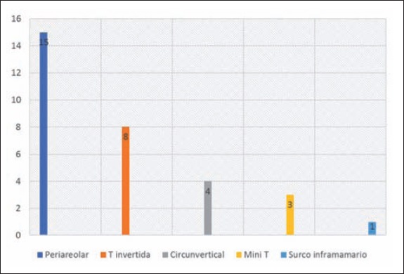 Las cicatrices encontradas en dichas pacientes fueron periareolares en un 48.3% (15 pacientes), en T invertida en un 25.8% (8 pacientes), circunverticales en un 12.9% (4 pacientes), mini T en un 9.6% (3 pacientes) e inframamarias en un 3.2% (1 paciente) (Gráfico 2).