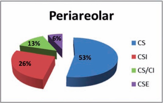 Vimos también que la cicatriz encontrada en mayor cuantía fue la periareolar, en un 48.3% de los casos, seguida de la cicatriz en T invertida en un 25.8%.