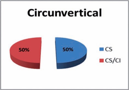 De las cicatrices periareolares, el 53.3% (8 pacientes) presentaban vasos que llegaban al CAP, predominantemente de los 2 cuadrantes superiores; en el 26% (4 pacientes) los vasos provenían del cuadrante súpero-interno, en el 13.3% (2 pacientes) proveniente tanto de los cuadrantes superiores como inferiores, y en el 6.6% (1 pacientes) los vasos dominantes correspondían al cuadrante súpero-externo. De las mamas con cicatriz en T invertida, el 62.5% (5 pacientes) presentaban irrigación dominante proveniente de los cuadrantes superiores, el 25% (2 pacientes) vasos provenientes del cuadrante súpero-interno, y el 12.5% (1 paciente) de los cuadrantes tanto superiores como inferiores. En las mamas con cicatrices circunverticales, el 50% (2 pacientes) presentaron vascularización proveniente tanto de los cuadrantes superiores como de los inferiores, y en el 50% (2 pacientes) la irrigación predominante procedía de los cuadrantes superiores. En el caso de las mamas con cicatrices en mini T, en el 66.6% (2 pacientes) los vasos sanguíneos principales tenían su origen en los cuadrantes superiores, y en el 33.3% (1 paciente) de los cuadrantes inferiores. Por último, en las mamas con cicatriz en el surco inframamario, en el 100% (1 paciente) la irrigación provenía predominantemente de los cuadrantes superiores (Gráficos 3)-(7).
