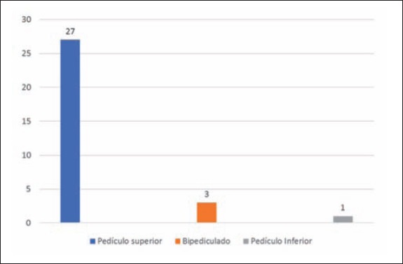 Por otro lado, en relación a las cirugías secundarias realizadas dependiendo de los patrones vasculares documentados en la tomosíntesis, observamos que en el 87% de los casos (27 pacientes) la técnica quirúrgica escogida fue la de pedículo superior. Estos casos fueron aquellos en los que los vasos predominantes en número y en calibre provenían de los cuadrantes superiores (superiores, súpero-internos, súpero-externos y en 2 casos superior/inferior). En el 9.6% (3 pacientes) decidimos la realización de una técnica bipediculada; estas fueron 3 de las pacientes en las que el predominio vascular era tanto de los cuadrantes superiores como de los inferiores. Por último, en el 3.2% de los casos (1 paciente), realizamos mastopexia mediante técnica de pedículo inferior; fue el caso en el que la tomosíntesis reportó predominio de la irrigación inferior (Gráfico 8).