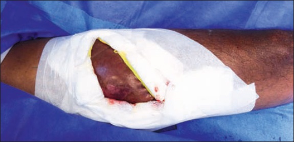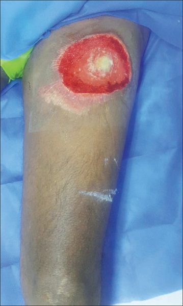Presentamos el caso de un paciente varón de 37 años de edad, sin antecedentes clínicos de importancia, que sufrió quemadura eléctrica por alto voltaje mientras trabajaba en una planta eléctrica, con punto de entrada en la mano izquierda y orificio de salida en la región anterolateral del tercio proximal del muslo izquierdo, ocasionando una quemadura de tercer grado de 12 x 10.5 cm (Fig. 2).