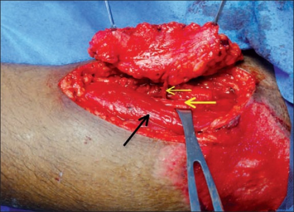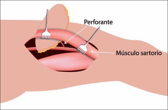 Una opción no descrita hasta ahora para lograr mayor avance cuando se encuentra un pedículo de corta longitud durante la disección, es la tunelización por debajo del músculo sartorio para lograr un mayor avance. En el caso del paciente que presentamos, se ideó esta técnica en el momento de encontrar una limitación en la longitud de la arteria perforante con respecto al área a cubrir, por lo que al tunelizar el colgajo por debajo del músculo sartorio logramos un avance significativo, de 2 cm, sin tensionar ni comprometer el pedículo.