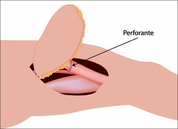 El colgajo medial de muslo es un colgajo fasciocutáneo tipo B localizado en los 2/3 proximales de la cara medial del muslo;(6) está basado en una rama septocutánea proveniente de la cara medial de la arteria femoral superficial, localizada aproximadamente 8 cm por debajo del ligamento inguinal en el ápex del triángulo femoral (Fig. 1). El diámetro de este pedículo dominante suele ser de 1.5 mm, con una longitud que varía entre los 2 a 4 cm. El nervio cutáneo anteromedial del muslo, rama del nervio femoral, penetra a través de la fascia en el muslo proximal para inervar la isla de piel.(7)