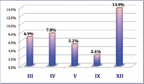 Al evaluar los estudio electromiográficos previos de los pacientes encontramos que los nervios más afectados además de VII y VI nervios craneales (NC) fueron el hipogloso o XII NC en el 13.9% (n= 16) de los pacientes, seguido por el IV NC en el 7.8% (n= 9), III en el 6.9%(n= 8), V en el 5.2% (n= 6) y el IX en el 2.6% (n= 3) (Fig. 2).